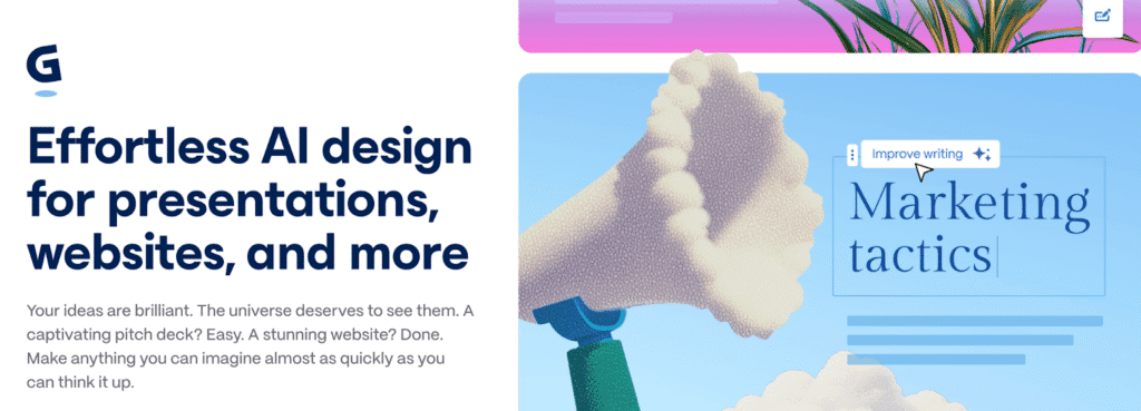 | Gamma.app | Narrative visuals | AI-driven storytelling | Scrollable reports, web content |