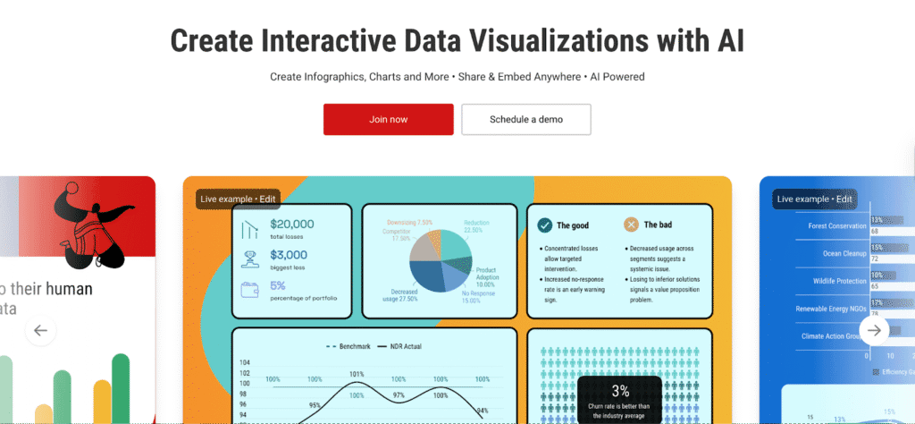 | Infogram | Live data visuals | Subtle AI, strong data | Dashboards, real-time charts |
