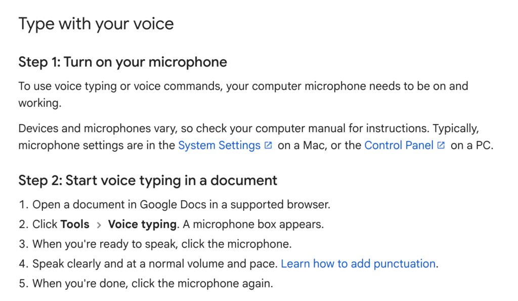 - Punctuation & Commands: Google Docs recognizes natural speech along with common formatting commands.