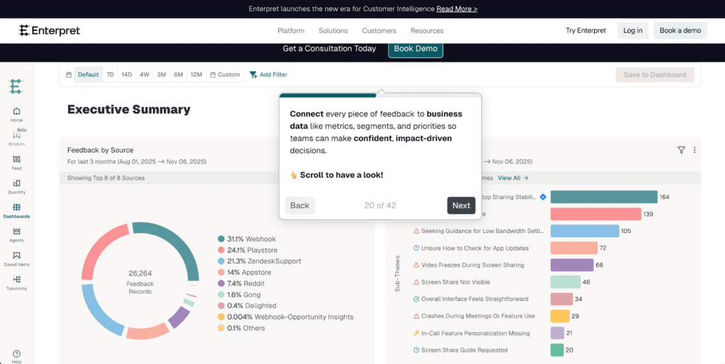 Enterpret is an AI-powered tool focused on analyzing customer feedback from many sources like reviews, surveys, and support calls. It uses customizable AI models tailored to each business, which helps detect not only sentiment but also a wide range of emotions such as joy, frustration, or sadness. This aspect makes it especially useful for companies wanting deep emotional insights beyond simple positive or negative labels. Enterpret also identifies trends over time and scores sentiment related to different aspects or topics, helping companies find specific areas to improve. With multilingual support and a cloud-based platform, Enterpret serves businesses of varying sizes looking for clear, actionable feedback insights.