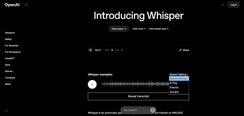 OpenAI Whisper is a powerful open-source speech recognition system designed to transcribe and understand spoken language. It excels at converting speech into written text with high accuracy and can recognize many languages and accents. Whisper is widely used by developers to add speech-to-text capabilities to apps, research, and automation tools. While it doesn’t provide voice synthesis or full voice agent functions, it plays a key role in turning spoken words into text that other AI systems use to respond properly. Its open nature makes it accessible for custom projects and innovation.