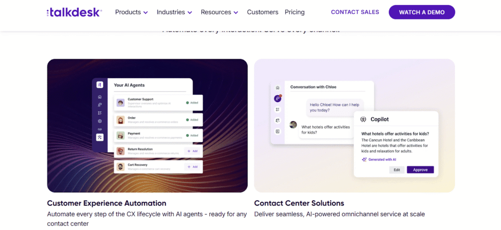 | Talkdesk | AI-powered call center automation and analytics | Smart call routing, live analytics, natural voice interaction |