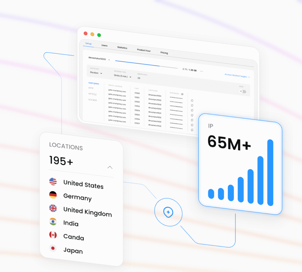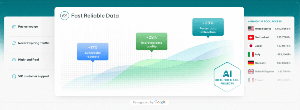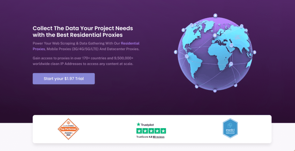 - Huge Proxy Pool: Over 175 million+ residential IPs across 195+ countries.