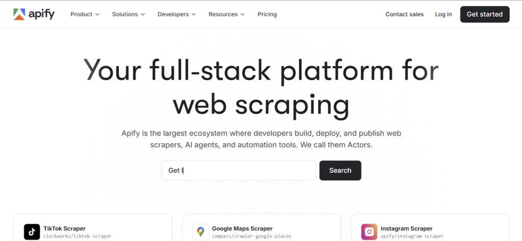 Apify combines no-code tools with options for coding custom scrapers. It offers a large store of ready-made scraping tools for popular sites. You can write your own scripts using JavaScript or Python. The whole system runs in the cloud with scheduling and monitoring. It fits beginners, developers, and big companies who need to scrape data on any scale.