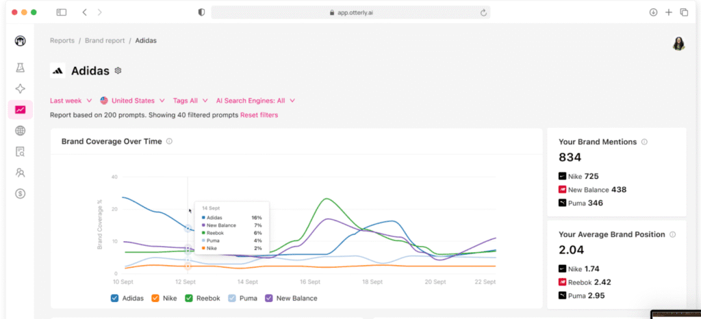 - Tracks Prompts, Brand Mentions: Otterly doesn’t just track appearances; it tells you tone, sentiment, and context.