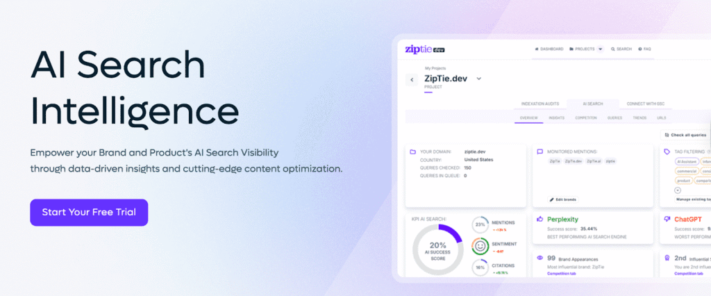 | ZipTie.dev | Developer-friendly AI-search tracking + AI-success scoring + content-optimization insights | Tech-savvy teams, agencies, or content networks with many pages wanting deep AI visibility data + actionable recommendations | Starts at $69/month |