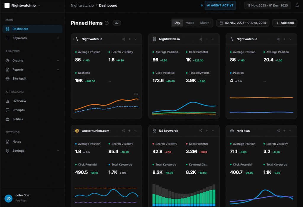 Nightwatch brings together traditional rank tracking and cutting-edge AI visibility under one roof. Its core strength lies in its robust, highly granular tracking across geographies, devices, search engines, paired with newer “AI-layer” insights that help you monitor how you might be showing up in AI-powered results.