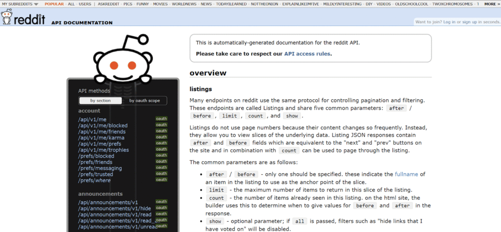 The Reddit API is the official channel provided by Reddit for developers to access and interact with Reddit’s extensive ecosystem programmatically. It enables retrieving data on posts, voting, commenting, and moderation tasks. The API enforces OAuth 2.0 authentication and rate limits to manage access and prevent any kind of abuse, making it suitable for applications requiring secure, real-time access to Reddit data. However, its rate limits and access restrictions can make large-scale scraping challenging, especially for bulk historical data.