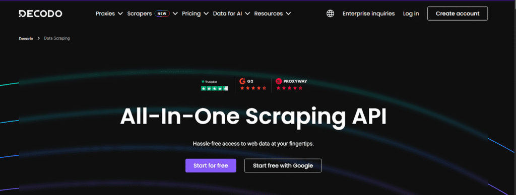 Decodo has an easy-to-use dashboard, browser extensions, and a suite of scraping tools, including an All-in-One Scraping API and a No-Code Scraper. While equipped with basic stealth tools and session rotations, its fundamental strength lies in simplifying the data extraction process.