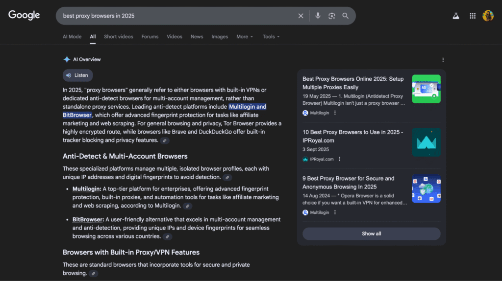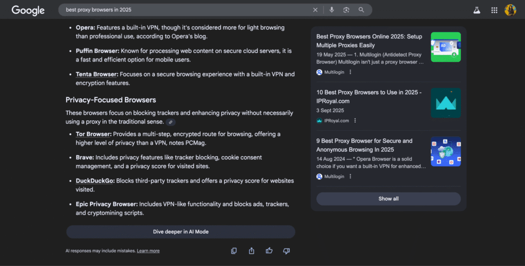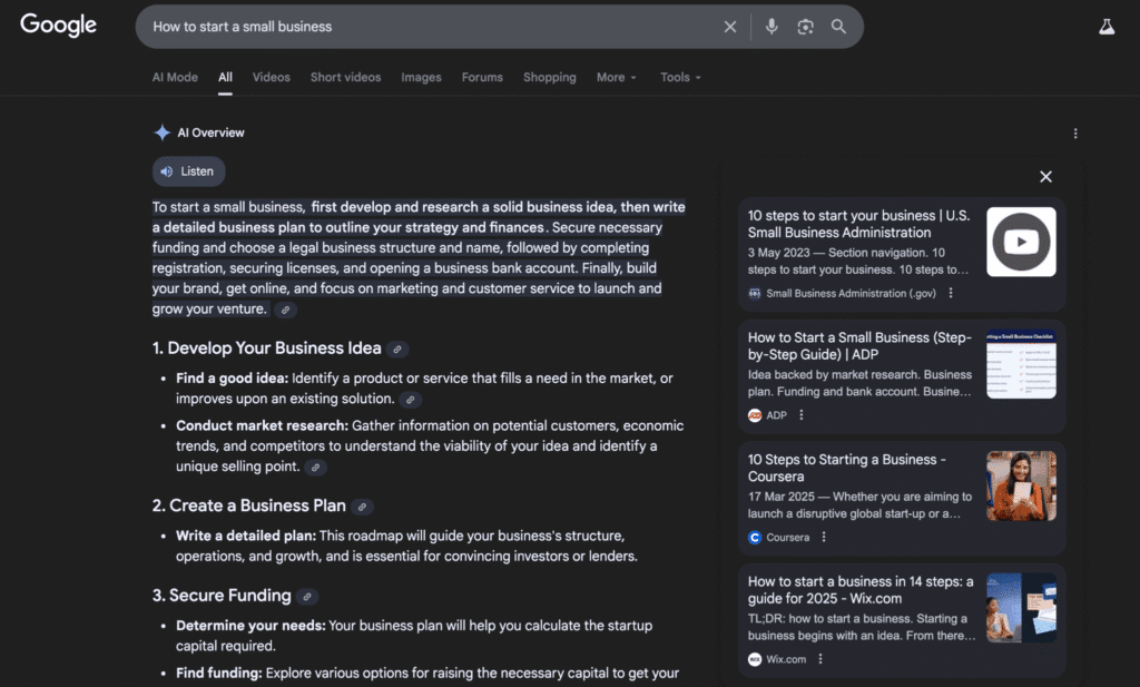 Instead of traditional rankings, Google AI Mode often displays a sidebar with cited sources. Brands that are authoritative and trustworthy have a higher chance of getting cited, meaning your credibility and content accuracy matter more than ever.