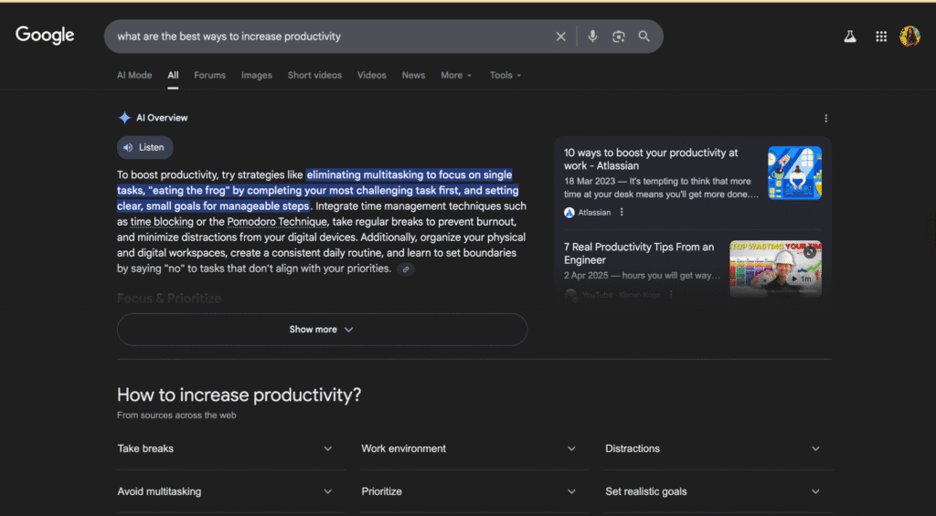 For marketers, this means Google AI Mode isn’t just about automating tasks. It’s about making smarter decisions faster. From predicting which ads will perform best to suggesting content topics your audience actually likes to see, it’s designed to increase precision.