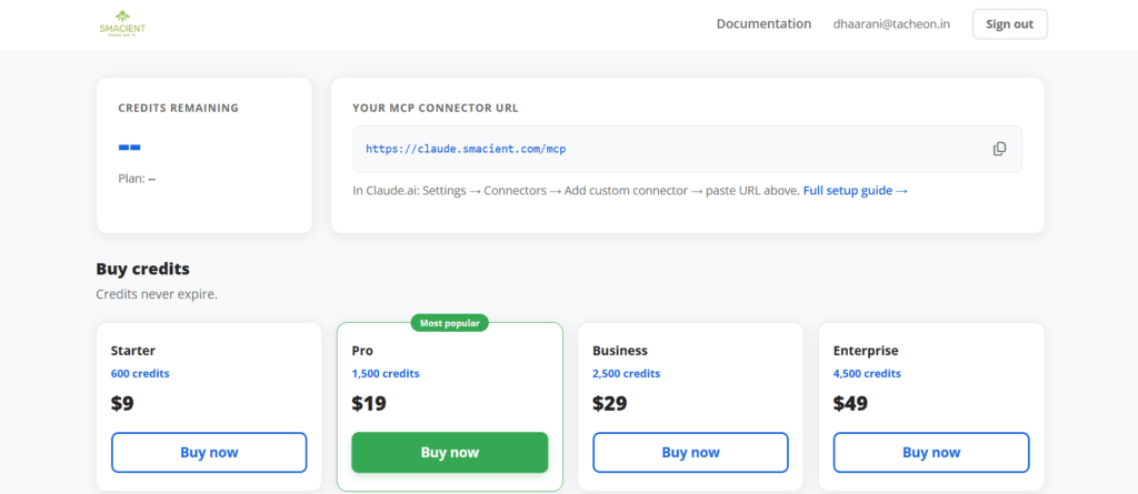 The signup process takes under two minutes. Once your account is live, you’ll land in the Smacient dashboard, where you can track your credit balance, view your extraction history, and find your connector URL.