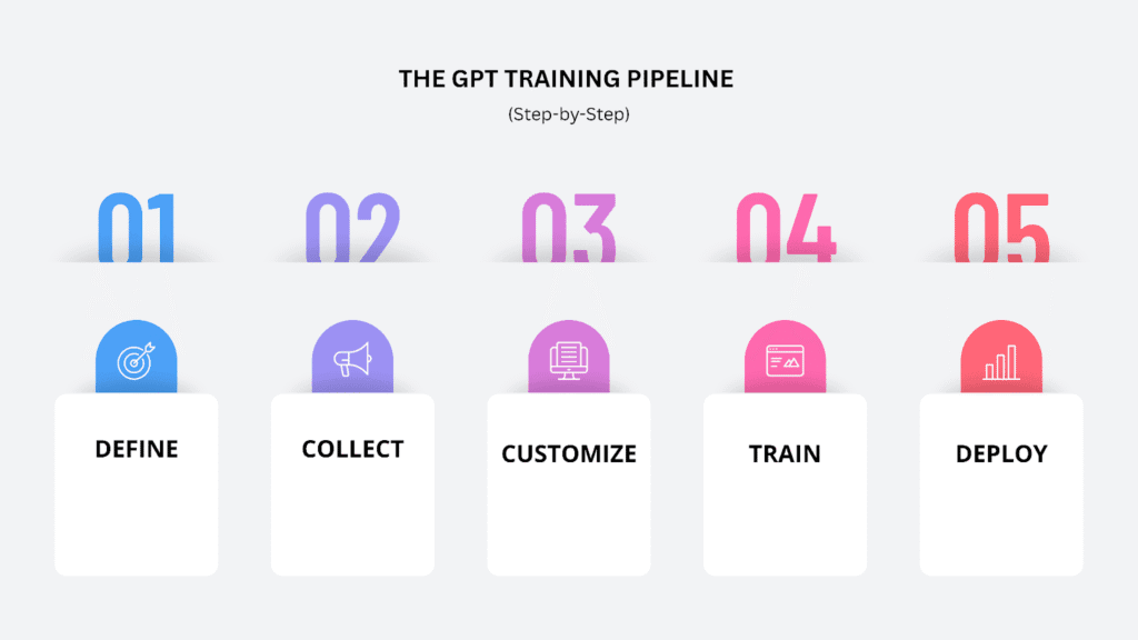 Training a GPT model may sound complex, but breaking it into clear steps makes the process manageable. Here’s a practical pipeline to guide you from concept to deployment: