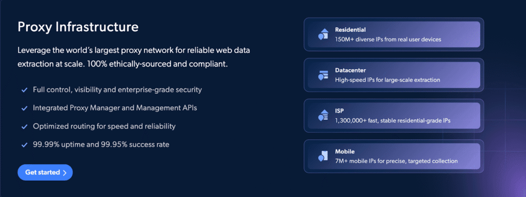 | Bright Data | Per request, sticky sessions | Country, city, ASN | Large-scale web scraping, enterprise data collection |