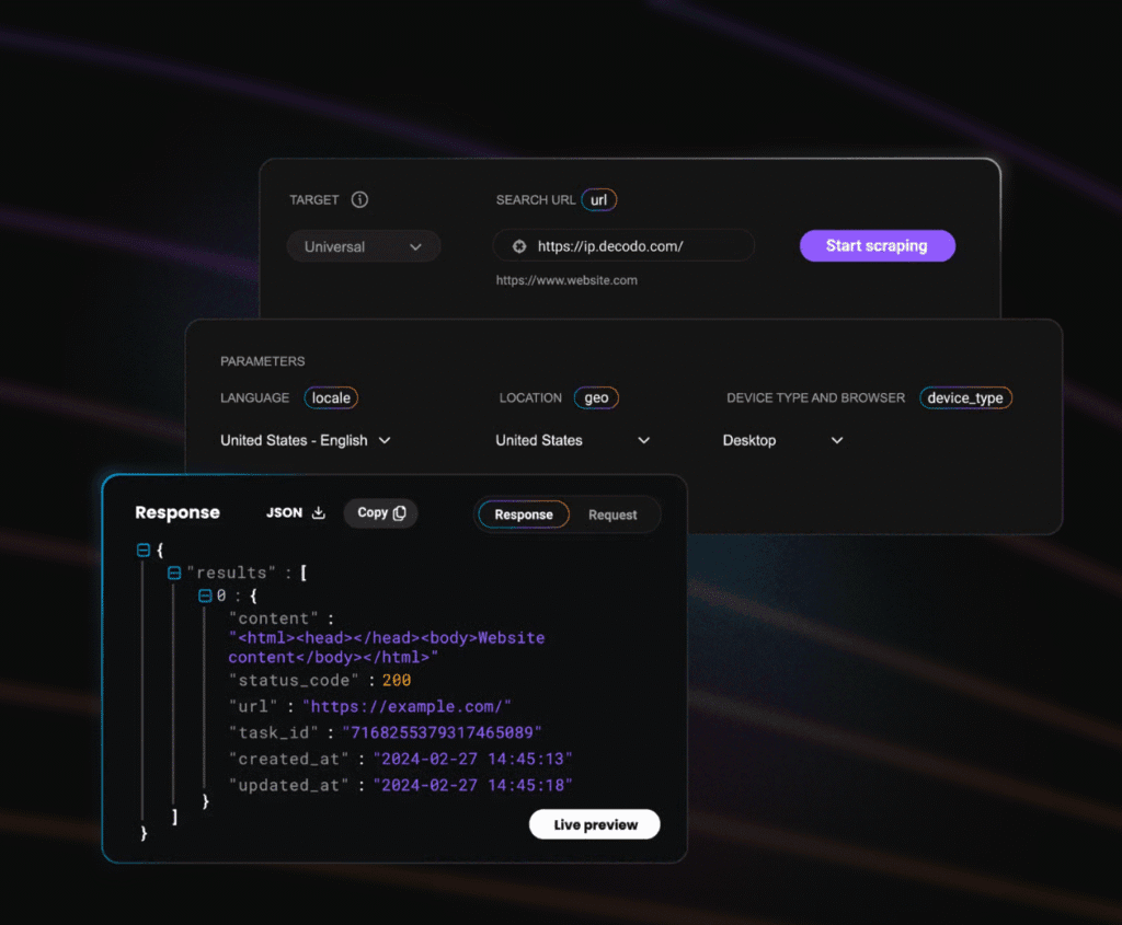 - Uniform output: JSON, HTML, or pre-parsed fields.