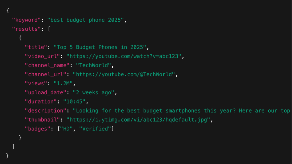 When you scrape a YouTube Search Results Page (SERP), you’re basically pulling all the essential information that decides what content ranks and why. This data is extremely useful for keyword research, competitor tracking, content planning, and understanding what type of videos perform best in your niche.