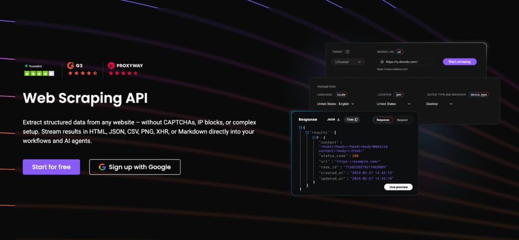 If you want to explore what this kind of setup looks like in practice, Decodo’s Web Scraping API page explains how proxy rotation, geo-targeting, and network diversity are handled under the hood.