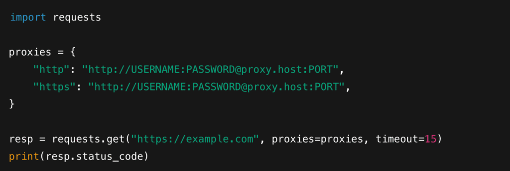 If you’re working with Python’s requests library, you can plus in your proxy details directly into a dictionary: