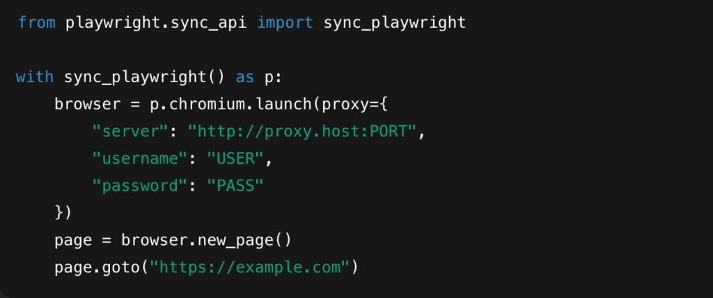 If you’re using Plywright for browser automation or scraping, you can pass proxy credentials while launching the browser: