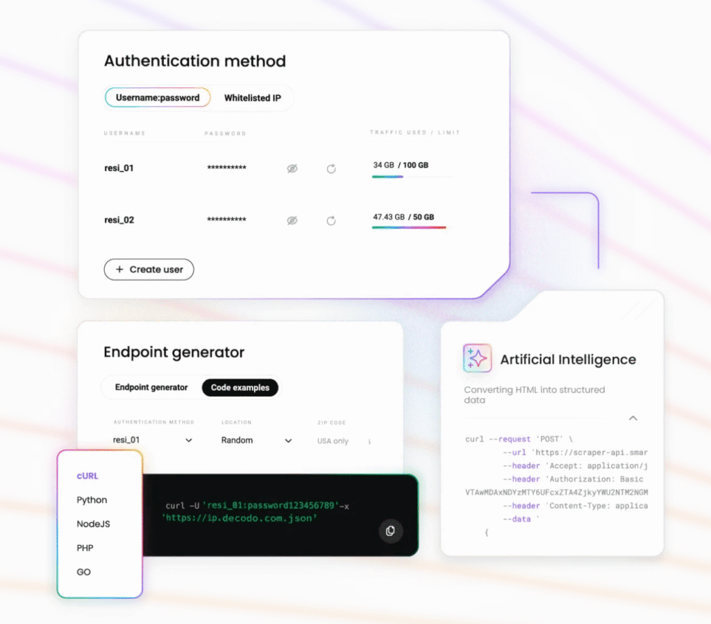Decodo provides a large residential IP pool, fine-grained geo targeting, and managed scraping endpoints. It is ideal for teams that want both proxy control and ready-to-use scraping tools with minimal infrastructure overhead.