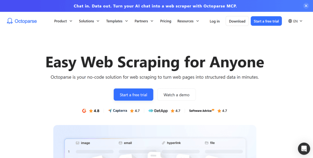 It supports cloud-based running and exports to Excel, CSV, Google Sheets, and databases. Octoparse is a reasonable option for teams that want more control over exactly what they collect but do not have developers available to write custom scripts.