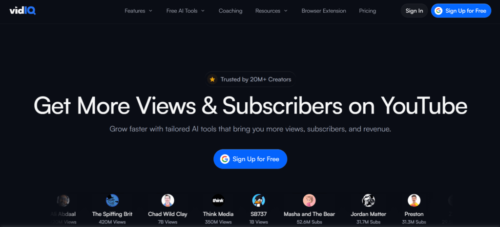 VidIQBrowser Extension + DashboardNoContent strategy and keyword optimizationNative YouTube dataFree tier + subscription