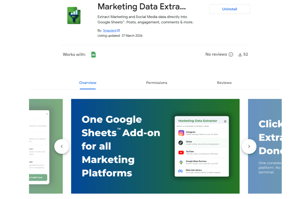 Marketing Data Extractor (Smacient)Google Sheets Add-OnNoNo-code YouTube + multi-platform extraction in SheetsYouTube, Instagram, TikTok, Google Maps, Meta AdsFree tier + one-time credits